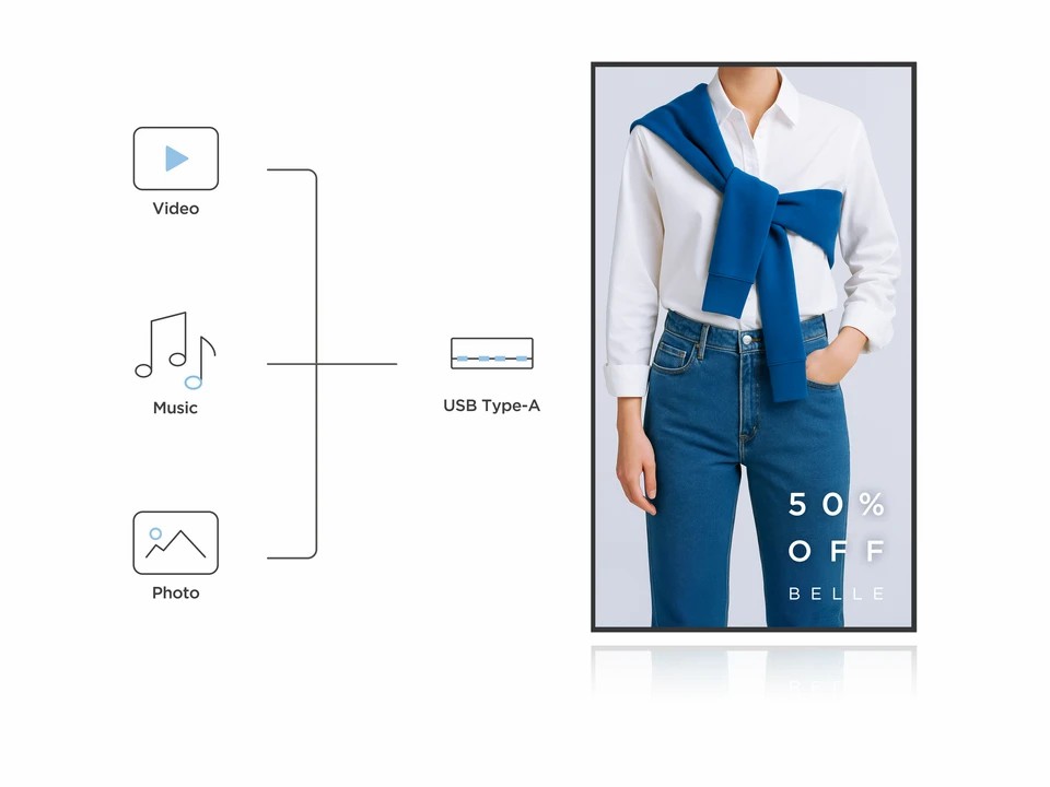 Hỗ trợ phát lại qua USB cho video, âm thanh và hình ảnh. Chức năng Khởi động từ Nguồn cho phép phát lại tự động, liền mạch mà không cần kết nối PC, tối ưu cho biển báo kỹ thuật số.