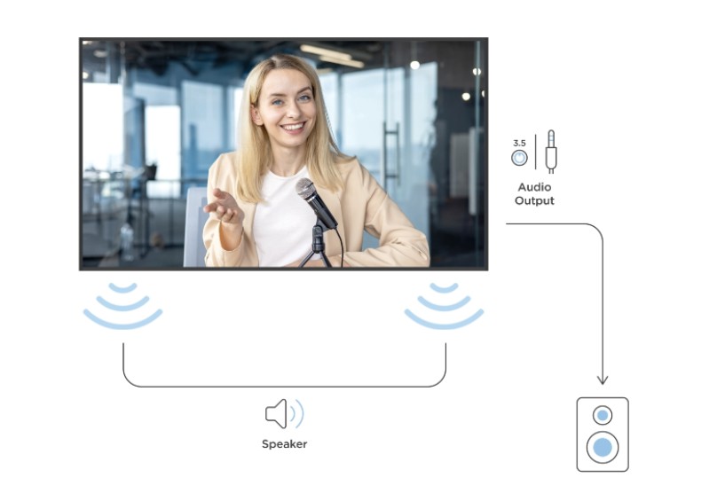 Hai loa 10W tích hợp mang âm thanh rõ ràng, phù hợp phòng họp nhỏ. Đầu ra 3,5 mm cho phép kết nối với hệ thống âm thanh ngoài, lý tưởng cho lớp học, sảnh chờ và địa điểm công cộng.