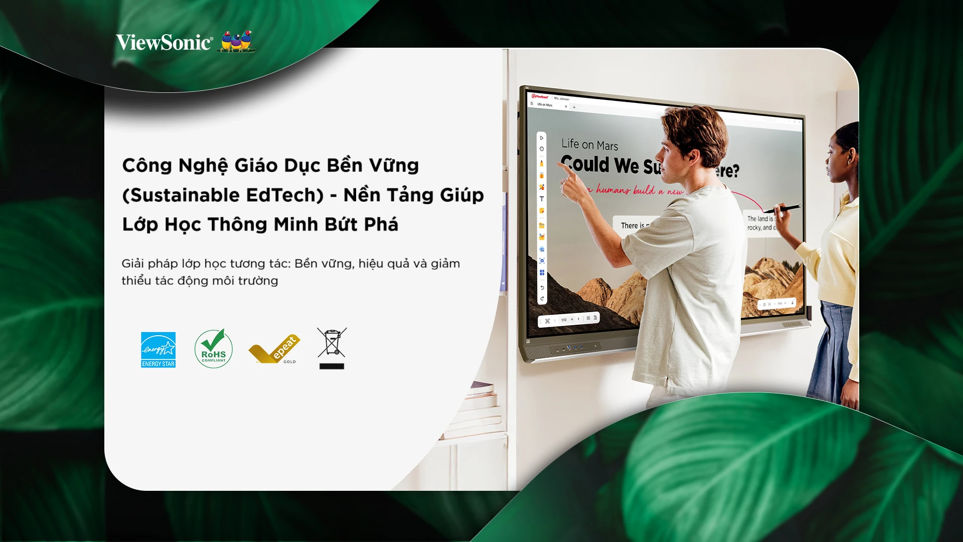 Vì thế giới ấy chính là tương lai mà thế hệ học sinh hôm nay sẽ trưởng thành trong đó. Bảo vệ tương lai ấy là trọng tâm và tầm nhìn của ViewSonic. Dòng sản phẩm màn hình tương tác ViewBoard thể hiện mọi khía cạnh trong nỗ lực ESG (Môi trường, Xã hội và Quản trị) toàn công ty của chúng tôi, không chỉ đáp ứng mà còn vượt xa các tiêu chuẩn bắt buộc để cải thiện giáo dục và giảm thiểu các tác động tiêu cực đến môi trường.