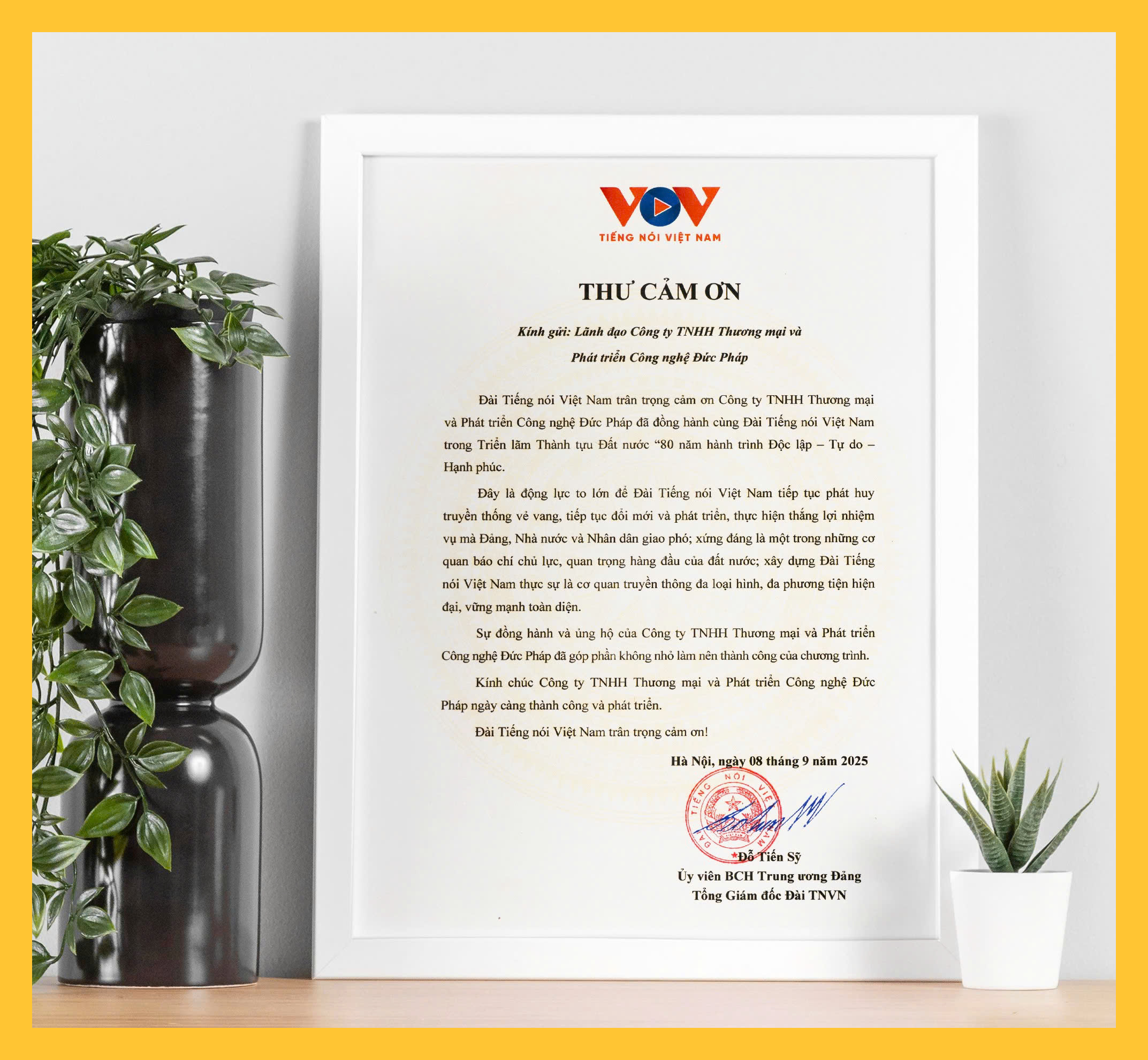 Công ty TNHH Thương mại và Phát triển Công nghệ Đức Pháp vinh hạnh khi nhận được lời cảm ơn từ Đài Tiếng nói Việt Nam VOV – một sự ghi nhận đầy ý nghĩa. Đây là nguồn động lực quý báu để doanh nghiệp tiếp tục khẳng định vai trò tiên phong trong ứng dụng công nghệ, góp phần lưu giữ và lan tỏa những giá trị thiêng liêng của dân tộc.