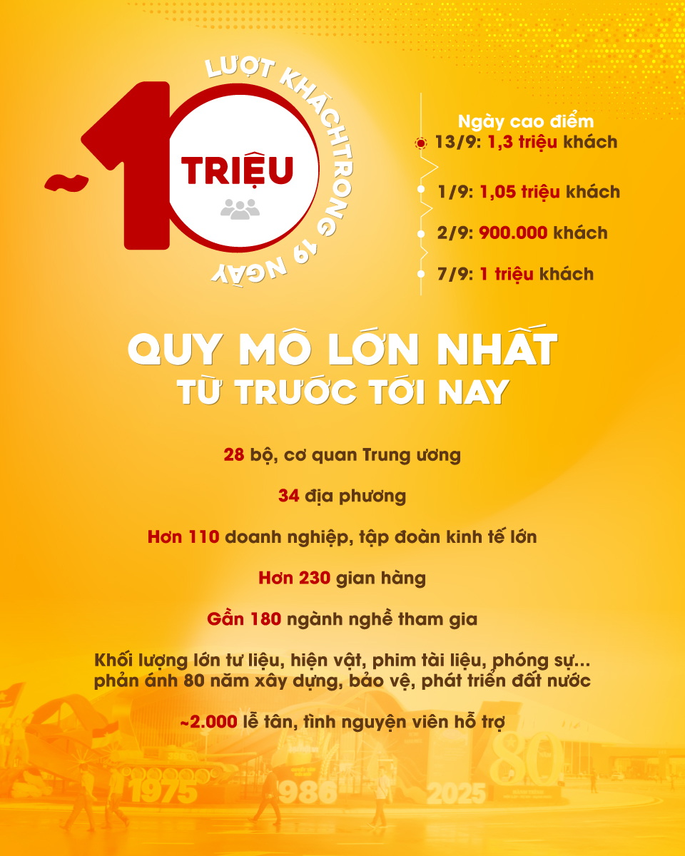 Sau 19 ngày diễn ra, triển lãm ghi nhận gần 10 triệu lượt khách tham quan, với những con số kỷ lục như ngày cao điểm 13/9 đạt 1,3 triệu khách, ngày 1/9 đón 1,05 triệu khách, ngày 2/9 có 900.000 khách và ngày 7/9 ghi nhận 1 triệu khách.