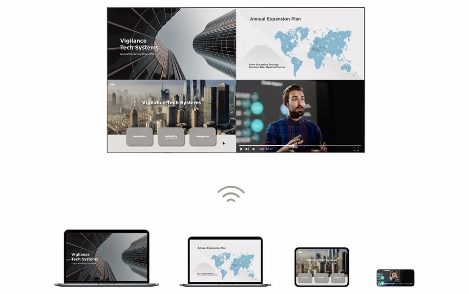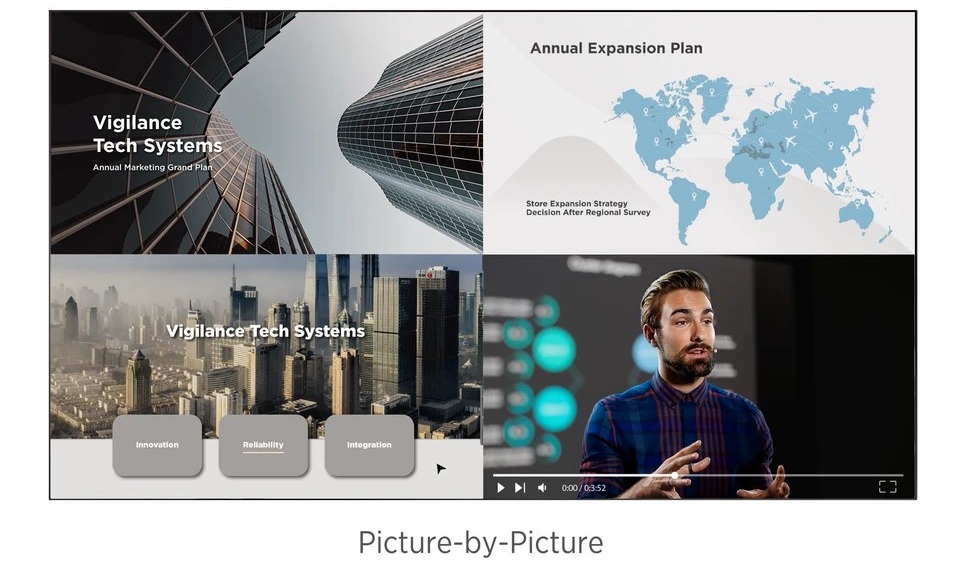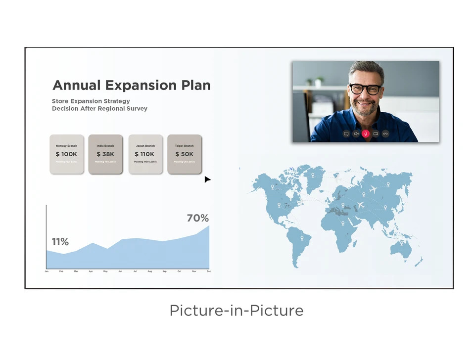 Ngoài ra, màn hình hỗ trợ hiển thị PIP/PBP, truyền phát không dây và điều khiển AV từ xa, mang đến sự linh hoạt và hiệu quả cao trong giảng dạy, hội họp và trình chiếu chuyên nghiệp.